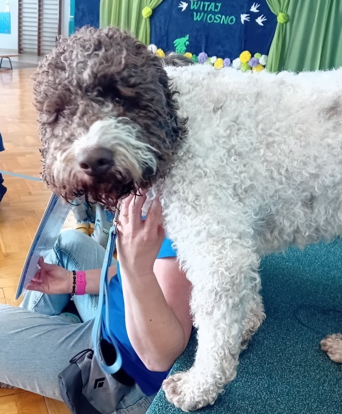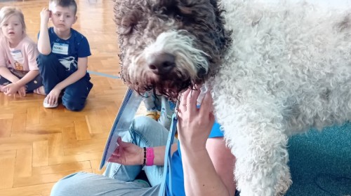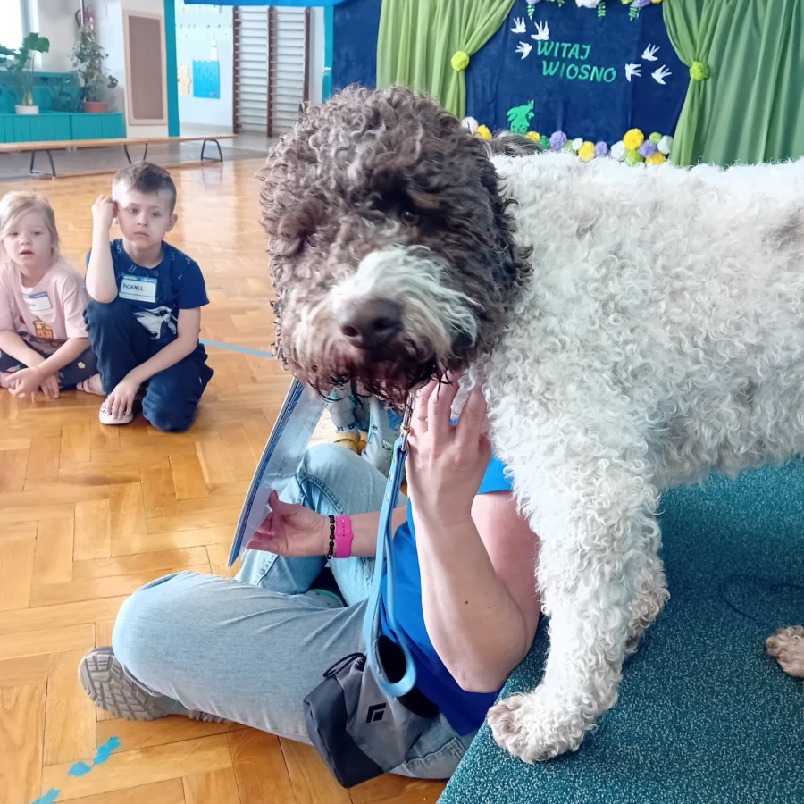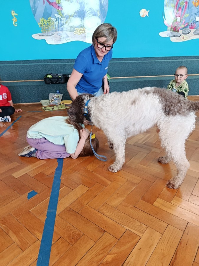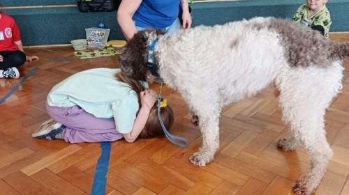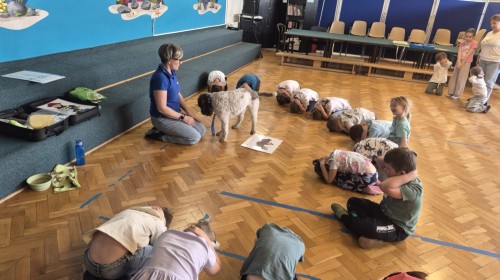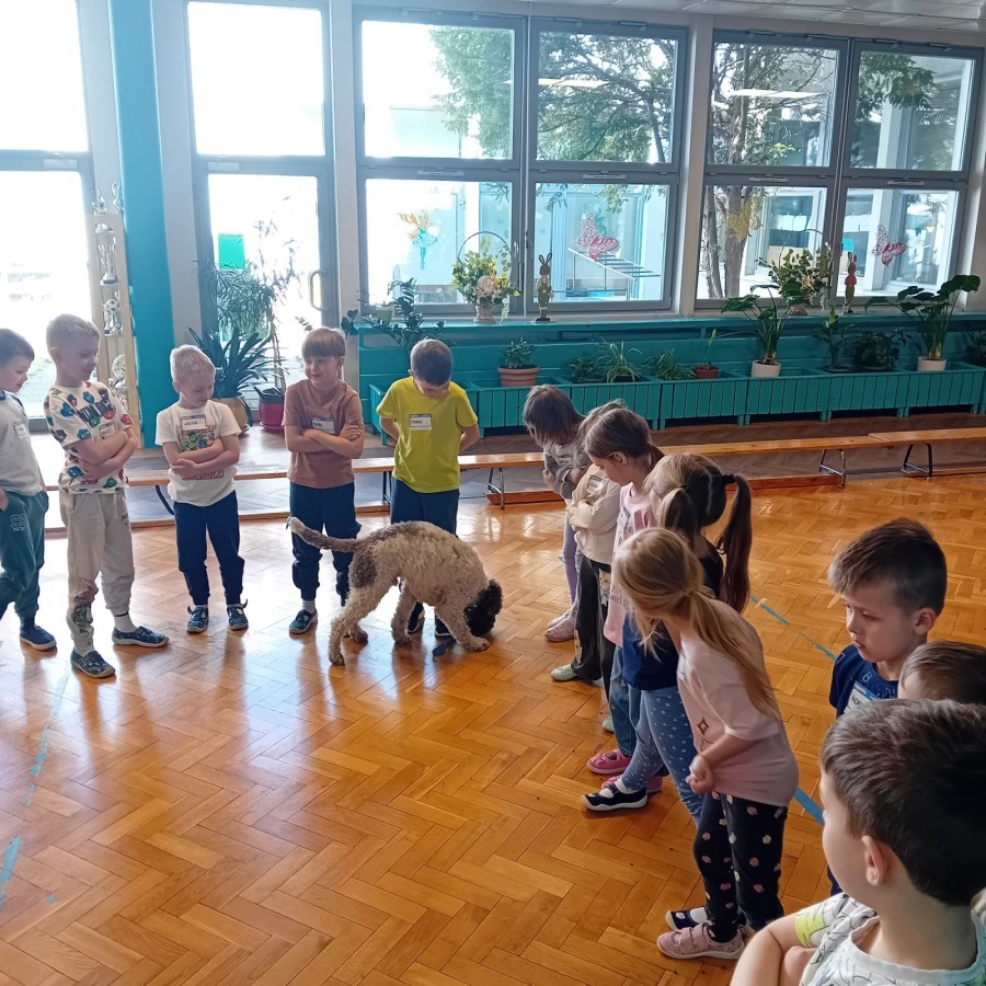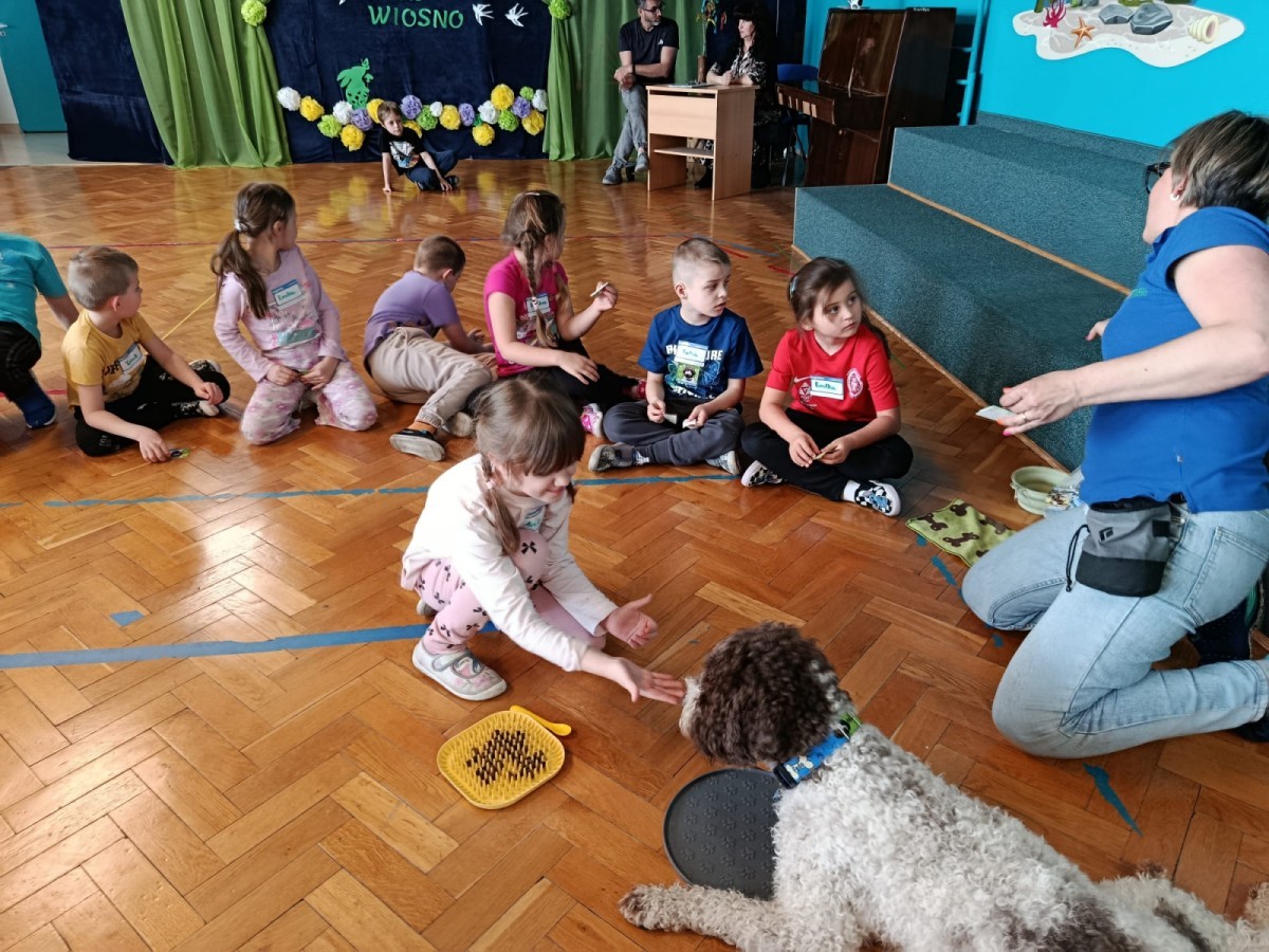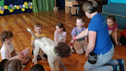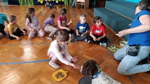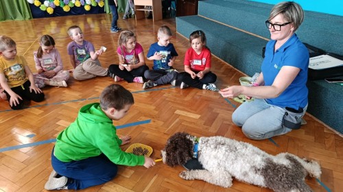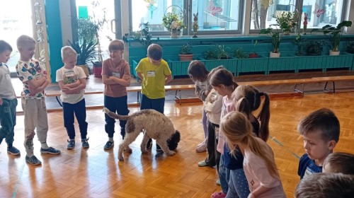 23 kwietnia do naszych starszych przedszkolaków przyjechał energiczny i przyjazny piesek Fado z Polskiego Centrum Dogoterapii Psia Edukacja mieszczącego się w Czechowicach - Dziedzicach. Podczas tego niesamowitego spotkania dzieci miały możliwość dowiedzieć się: