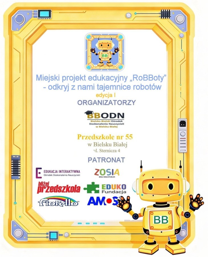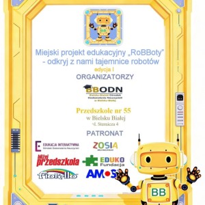 Bielsko-Bialski Ośrodek Doskonalenia Nauczycieli oraz Przedszkole nr 55 w Bielsku-Białej mamy zaszczyt przedstawić wspólną inicjatywę na rzecz bezpieczeństwa w sieci, cyfryzacji oraz zdrowia psychicznego dzieci w postaci Miejskiego Projektu Edukacyjnego „RoBBoty” w którym biorą udział liczne przedszkola z terenu miasta Bielsko-Biała.