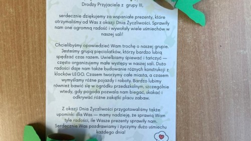 Z okazji Światowego Dnia Życzliwości nasze przedszkole wzięło udział w akcji zorganizowanej przez Panią Agnieszkę Szczelinę - Szczotkę doradcę metodycznego z BBODN. Akcja skierowana była do wszystkich przedszkoli z Bielska- Białej, które wyraziły chęć udziału. Przedszkole 55 podjęło się tego wyzwania i w Dniu Życzliwości 21 listopada, nasze grupy powędrowały do swoich starszych i młodszych kolegów z własnoręcznie wykonanymi prezentami oraz listami pełnymi życzliwych słów. Oprócz gestów szacunku i przyjaźni, uśmiechów i miłych słów, były także wesołe zabawy i tańce, którymi pokazaliśmy jak nasze przedszkolaki potrafią i chcą wspólnie spędzać czas, bez względu na wiek i umiejętności.