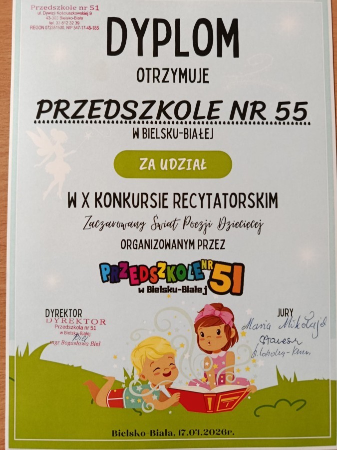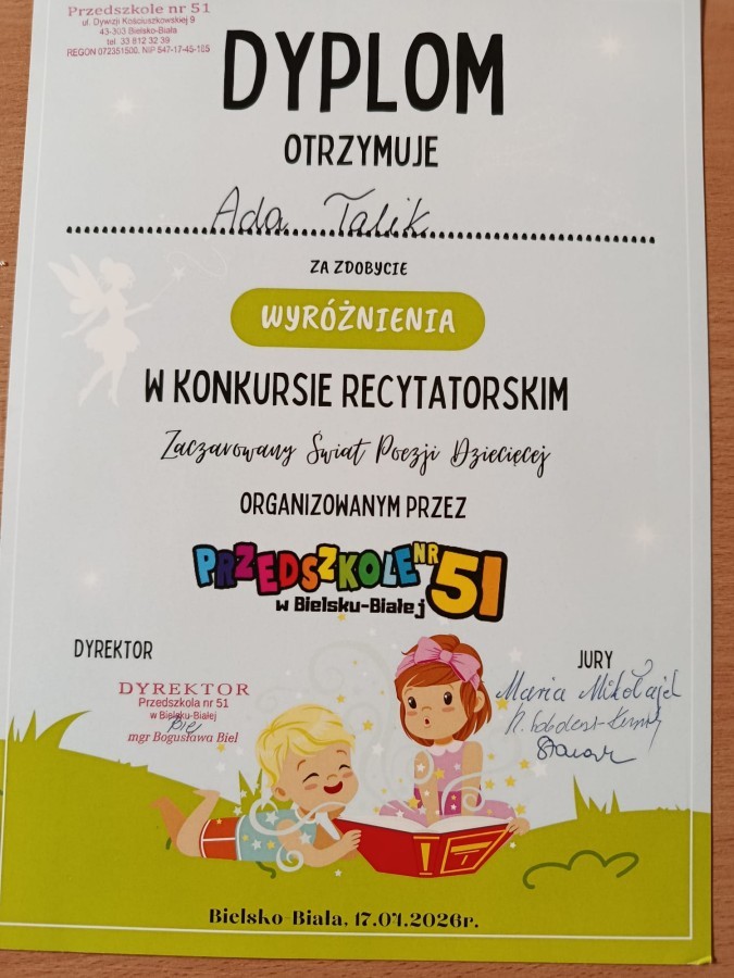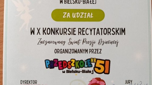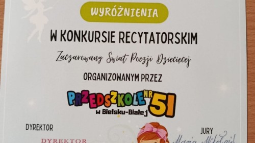 W dniu 17 kwietnia dwie nasze reprezentantki z grupy VIII, Karolina K. i Ada T., wzięły udział w międzyprzedszkolnym konkursie recytatorskim "Zaczarowany Świat Poezji Dziecięcej" zorganizowanym przez Przedszkole 51. Dziewczynki spisały się na medal, a Ada z wierszem Jana Brzechwy pt. "Jeż", zdobyła wyróżnienie.